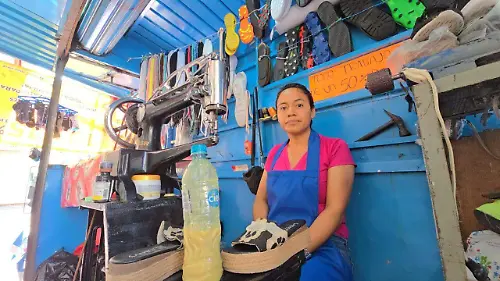 Con 38 años y dos hijos que dependen de ella, Aurora Hidalgo Longines trabaja de lunes a sábado en un pequeño local de Velázquez de León, donde repara zapatos, mochilas y bolsas para llevar el sustento a casa